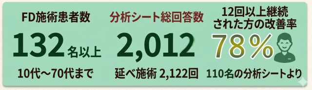FD施術実績 132名以上・改善率78%・2,012回のデータに基づく専門分析