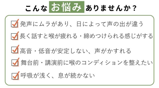 声を使うお仕事の方にとって、思うように声が出ない・喉に違和感がある・呼吸がしづらいといった悩みは深刻です。